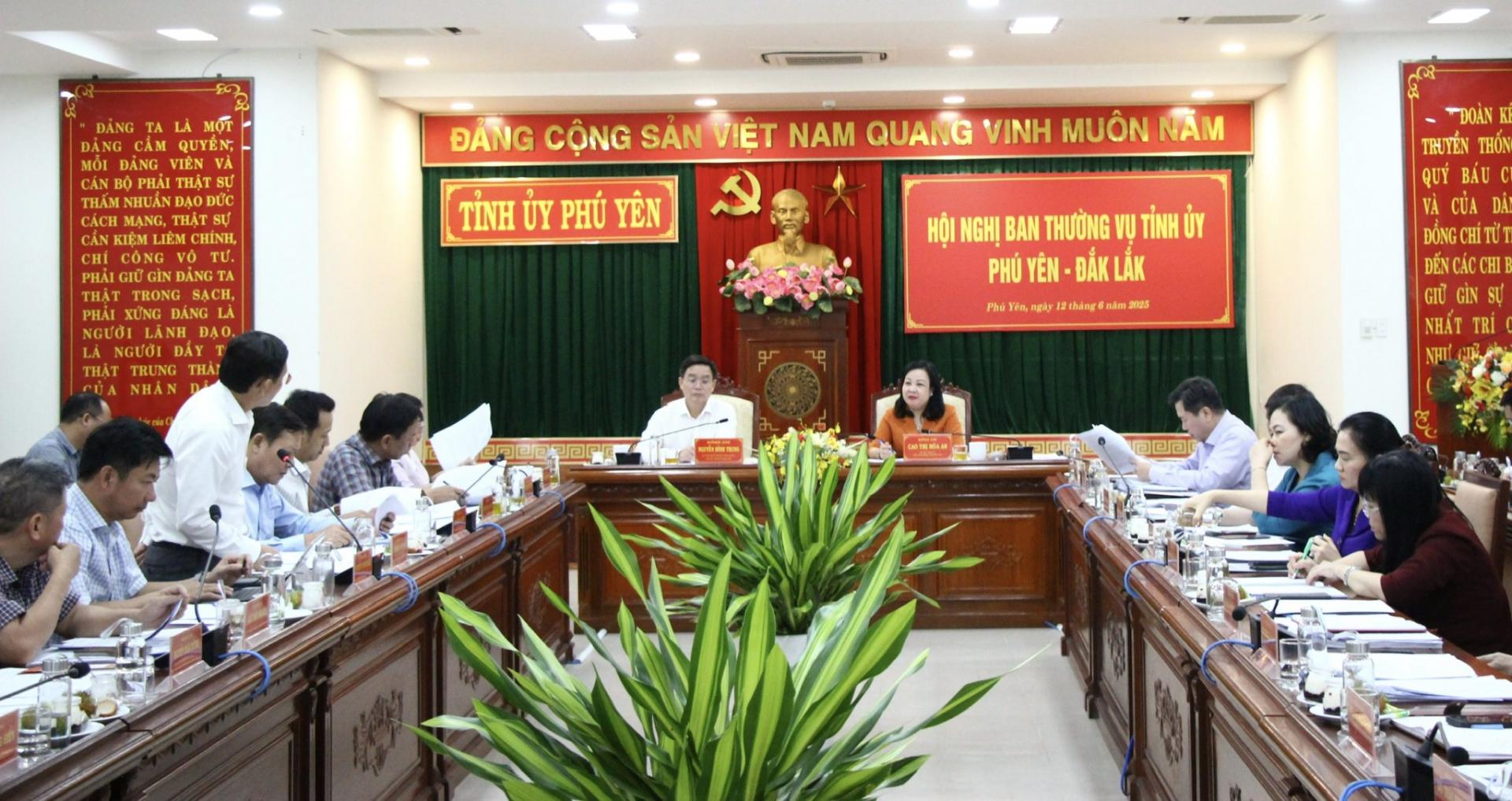 Ngày 12/6, tại Tỉnh ủy Phú Yên, các đồng chí Bí thư Tỉnh ủy Phú Yên Cao Thị Hòa An và Bí thư Tỉnh ủy Đắk Lắk Nguyễn Đình Trung đã chủ trì Hội nghị Ban Thường vụ Tỉnh ủy Phú Yên - Đắk Lắk. Tham dự hội nghị có các đồng chí trong Ban Thường vụ Tỉnh ủy, lãnh đạo UBND tỉnh cùng một số sở, ngành của 2 tỉnh.